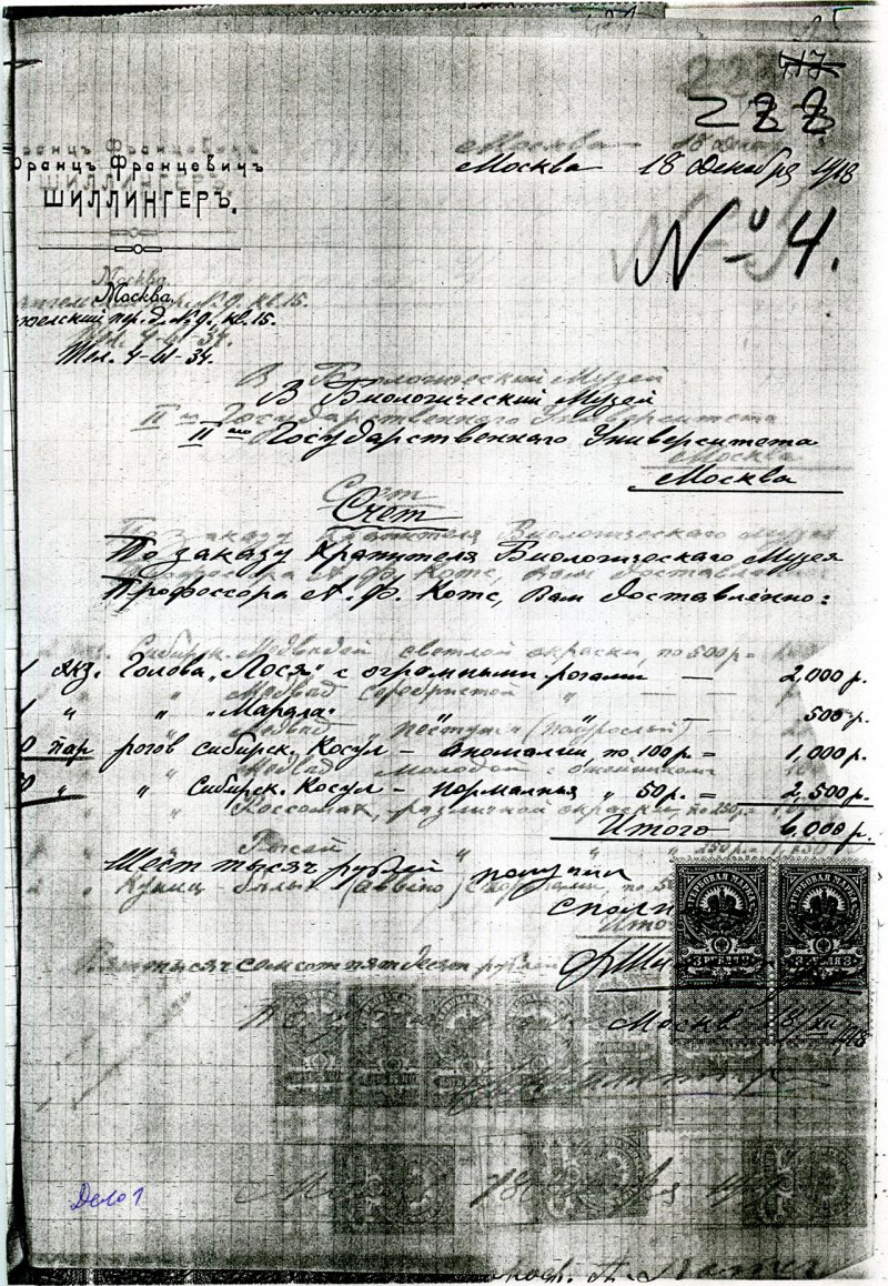 Счет московской мастерской Ф.Ф. Шиллингера Биологическому музею II-го Государственного университета (Дарвиновскому музею), 1919 год.