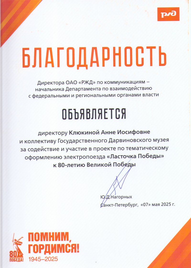 Благодарность Дарвиновскому музею от Российских железных дорог
