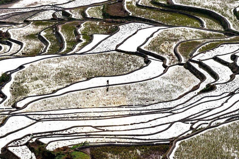 Закат над террасными рисовыми полями Laohuzui под городом Yuanyang, Yunnan - шедевром строительного мастерства народов Hani и Yi.
